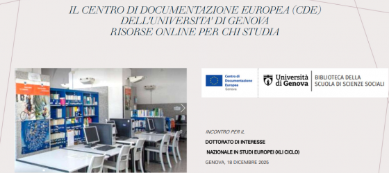 Oggi si è tenuto l'incontro Risorse bibliografiche e servizi della Biblioteca della scuola di scienze sociali e del Sistema bibliotecario di Ateneo durante il quale è stato possibile presentare le attività del Centro di documentazione europea di Genova.